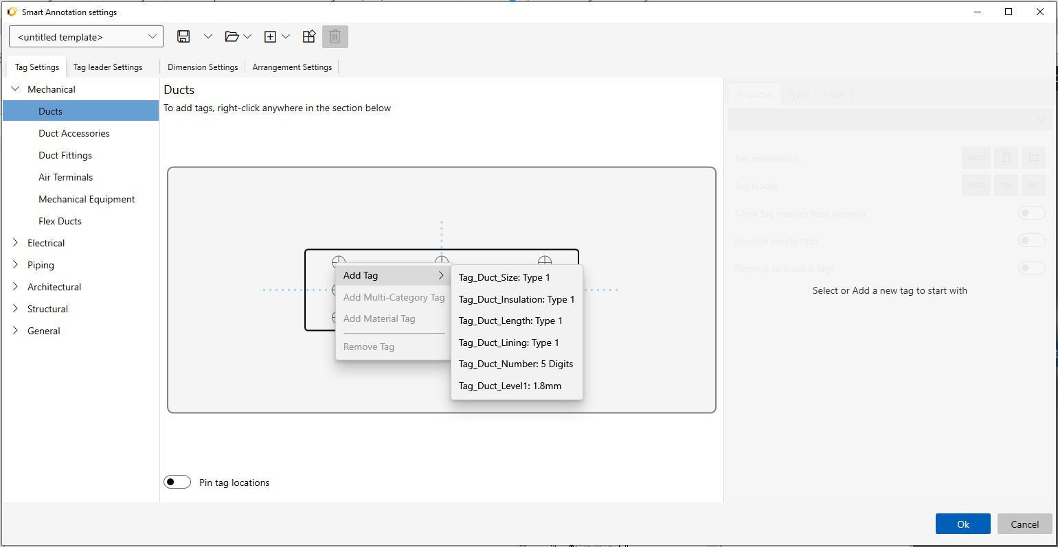 4. In the center preview area, right-click on the dashed crosshairs, choose Add Tag, and select the desired tag family (e.g., M_Door_Tag, M_Material_Tag).